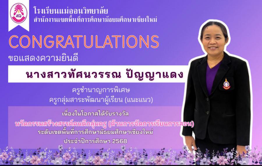 โรงเรียนแม่ออนวิทยาลัย ขอแสดงความยินดีกับคณะครูโรงเรียนแม่ออนวิทยาลัย ????เนื่องในโอกาสได้รับรางวัล นวัตกรรมสร้างสรรค์คนดี กลุ่มครู (ด้านการจัดการเรียนการสอน) ระดับเขตพื้นที่การศึกษามัธยมศึกษาเชียงใหม่ ประจำปีการศึกษา 2568 ???????? นางสาวทัศนวรรณ ปัญญาแดง ระดับดีเยี่ยม ???????? นางนฤมล หลวงภักดี ระดับดีเยี่ยม ???????? นายชินโชติ ธรรมสอน ระดับดีเยี่ยม ???????? นางสาวรินทร์รมิดา เปลี่ยนวอน ระดับดีเยี่ยม #เรียนดีมีคุณธรรม #เรียนรู้เพื่อชีวิตลิขิตอนาคต #LearnForLife #DefineTheFuture #แม่ออนวิทยาลัย #โรงเรียนกพด. S:0