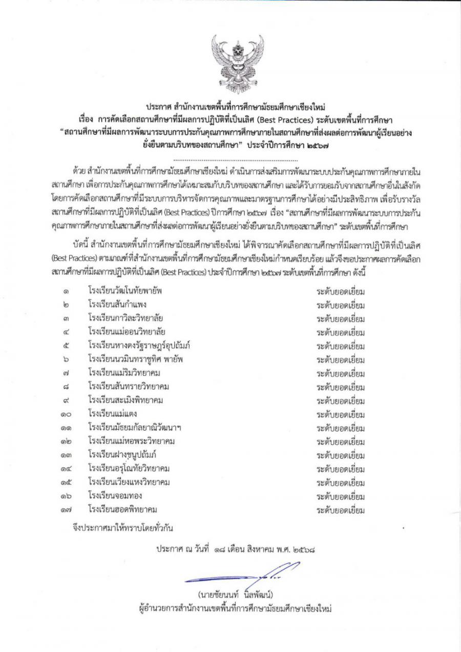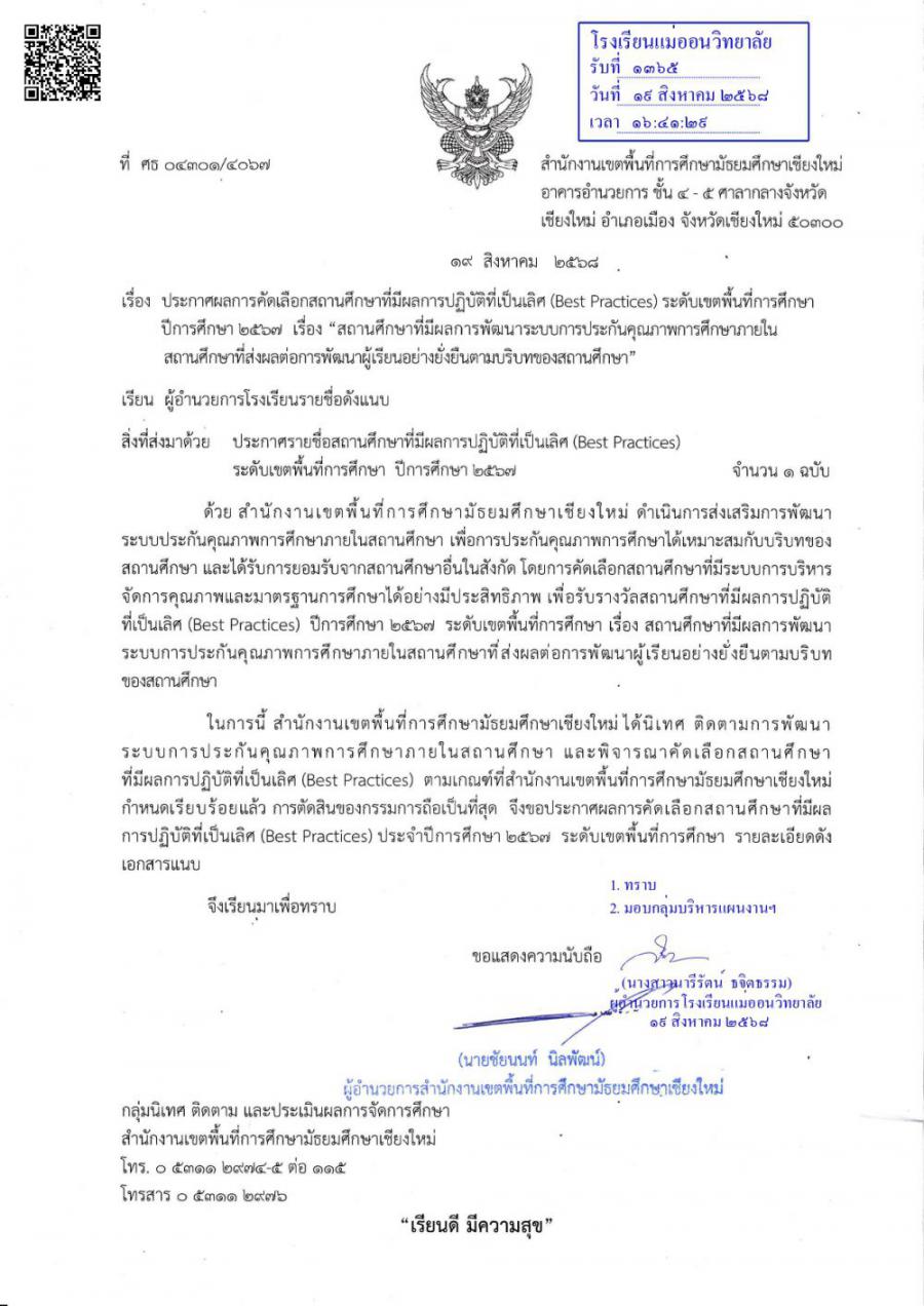 โรงเรียนแม่ออนวิทยาลัย ได้รับรางวัล สถานศึกษาที่มีผลการปฏิบัติที่เป็นเลิศ (Best Practices) ระดับ ยอดเยี่ยม การพัฒนาระบบประกันคุณภาพภายในสถานศึกษาที่ส่งผลต่อการพัฒนาผู้เรียนอย่างยั่งยืนตามบริบทของสถานศึกษา ปีการศึกษา 2567 ระดับเขตพื้นที่การศึกษา S:0